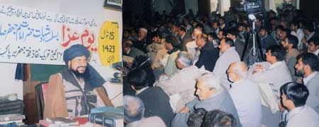 RAWALPINDI, Pakistan Dec 20: Orators from Tanzeem Shia Aimmah Masajid highlighting the holy life of Hazrat Imam Jafar Al-Sadiq (AS) in Friday congregations on the occasion of countrywide Youm-e-Aza announced by Quaid-e-Millat-e-Jafariya Pakistan Agha Syed Hamid Ali Shah Moosavi to mark the martyrdom anniversary of Sadiq-e-Aal-e-Muhammad Hazrat Jafar Ibn-e-Muhammad (AS) termed Imam (AS)s Seerat & Character and holy teachings a guarantee to resolve most difficult problems in the present era. Addressing a Friday congregation at Markazi Shia Jamia Masjid Darbar Shah Chan Charagh Rawalpindi, Imam Juma Wal Jamat Allama Saqalain Ali Bukhari said Hazrat Imam Al-Sadiq (AS) accomplished valuable services for promotion of Divine learning and practical implementation of principles of Mohammedan Shariah. He said the springs of Islam everywhere are under obligation to these holy personalities (AS). A resolution adopted on this occasion, demanded from the government to implement 11 Shia Demands existing on the agenda of May 21, 1985 Junejo-Moosavi agreement. To exert pressure on the Saudi government for reconstruction of Jannatul Baqee is one of 11 Shia Demands. The resolution said that if the government and journalistic institutions could show diligence, ardour and earnestness for the construction of the tomb of Maulana Zafar Ali Khan then why they are silent and mum regarding the reconstruction of the shrines of The Master of two worlds (SAW)s beloved daughter The Mistress of the Ladies of the Paradise Hazrat Sayidah Fatimah Zahra (SA), The family of Ahl-e-Bait-e-Athar (AS), Ummahatul Momineenm (RA) and Companions of Prophet (SAW)? In the same cemetery of Jannatul Baqee, the grave of Hazrat Imam Jafar Al-Sadiq (AS) is demolished for the last 76 years. The resolution demanded from the government to pressurize the Saudi government for rehabilitation of Holy Shrines, and if they could not do so, permit us to construct these shrines. By another resolution, the Friday congregation expressed full solidarity with the oppressed of the world strongly condemning the death penalty awarded to three innocent Kashmiris accused of aiding last year attack on Indian Parliament as well as atrocities of the United States along with its stooges India and Israel in Kashmir, Palestine and Chechnya. Allama Syed Matloob Taqi addressed a gathering at Masjid Kazmia Darbar Sakhi Shah Pyara Kazmi Al-Mashhadi. The gathering passed a resolution which protesting against the inclusion by the US government of several Islamic countries including Pakistan in the list of suspected states with regard to terrorism urged Islamic countries to get them freed from American grip and gather at a platform to foil colonial conspiracies. Allama Tanvir Kazmi addressed at Qasr e Shabbir Dhok Syedan, Allama Qamar Abbas at Haideria Masjid Chittian Hattian, Allama Al-Hussaini at Danish Gah-e-Jafria, Allama Qalb-e-Abbas Khawarzmi at Masjid Isna Ashari Greasy Line Chaklala, Allama Hussain Moqaddesi at Masjid Ahl-e-Bait Wah Cantt, Allama Basharat Hussein at Masjid & Imambargah Qasr e Khadijatul Kubra Tarlai Kalan, Allama Ikhlaq Kazmi at Qasr e Imam Moosa Kazim, Allama Tasawwur Naqvi at Masjid Imamia Hassan Abdal, Allama Gardezi at Masjid Jafria Dhalyala, Allama Fakar Abbas at Masjid Baitul Huzn Ali Pur Farash, Allama Ashiq Hussain at Shia Jamia Masjid Hassanabad and Allama Awsaf Haider Naqvi addressed at Masjid Jafria Hadala Syedan. END