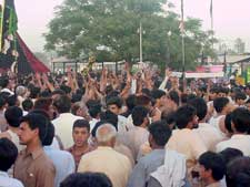 ISLAMABAD, Pakistan, May 31: A grand Majlis-e-Aza under the arrangements of All Pakistan Syed Faqeer Matami Tanzim was held at Dera Sakhi Shah Chan Charagh in Darbar Hazrat Bari Imam Moosavi Al-Mashhadi (R.A.), Islamabad, in connection with Annual Pursadari. Renowned ulema, waizeen and zakireen addressed the Majlis after which Zuljinah procession was taken out. Thousands of Matamdaraan who thronged the occasion adopted resolutions presented by central leader of Mukhtar Force Pakistan (MFP) Ch. Mushtaq Hussain raising vociferous slogans. A resolution said that the country was confronted with one problem or the other from within and without, and in these circumstances it was obligatory for rulers, politicians, and patriotic forces to give priority to the integrity and solidarity of the motherland over all other matters, work for promotion of Basic Ideology that could only be possible when rights of all schools of thought living in Pakistan are given on the basis of equality. The resolution lamented that people of the country were deprived even of their basic rights for quite long, therefore, the rulers should ensure fulfillment of rights of all schools of thought under the constitutional norms because Islam is the official religion under the Constitution of Pakistan but a particular Maktab is entertained in all departments increasing the sense of deprivation amongst other Makatab. The resolution demanded from the government to remove the unrest from amongst the ranks of Millat-i-Jafariya by implementing May 21, 1985 Junejo-Moosavi agreement for solution of long-standing problems of the Maktab-e-Tashayyo. Another resolution expressed its concern that the Darbar of Hazrat Bari Imam Moosavi Al-Mashadi (R.A.) is under the control of a particular group since Ayub era and they have no link whatsoever with Hazrat Bari Imam (R.A.). The government should take notice of this fact, the renovation of the tomb should be made with due reverence while plan for its expansion should be completed as early as possible otherwise the administrative control of the tomb should be handed over to the real inheritors of the Bari Sarkar (R.A.). The resolution made it clear that Hazrat Bari Imam (R.A.) and other Mashaheer-e-Islam always expressed hatred for oppressors and supported the oppressed, therefore, oppressed the world over, including the oppressed people of Kashmir and Palestine, should be extended support and no one should be allowed to bargain the blood, shed by Martyrs of Kashmir and Palestine. Yet another resolution adopted by participants of Annual Matamdari reiterated their resolve to offer any sacrifice for the mission of Wila and Aza and for achievement of religious rights of the Millat-i-Jafariya on the call of Quaid-i-Millat-i-Jafariya Agha Syed Hamid Ali Shah Moosavi. Later, all Matmi processions taken out from Dera Sakhi Shah Chan Charagh and other Deras terminated after reaching the Darbar of Hazrat Bari Imam (R.A.) where Bawa Syed Riaz Hussain Shah led the Dua and Zairat. END